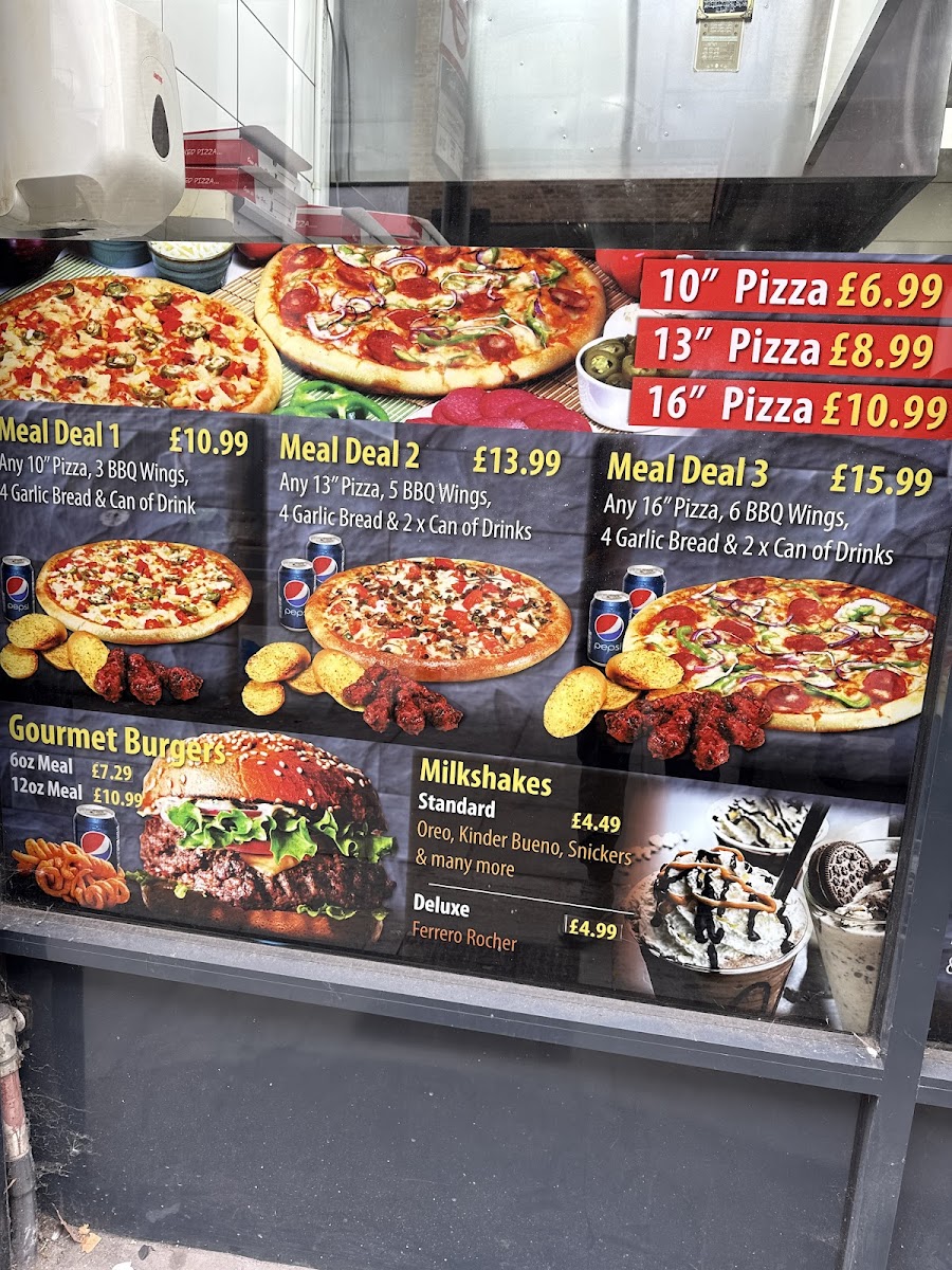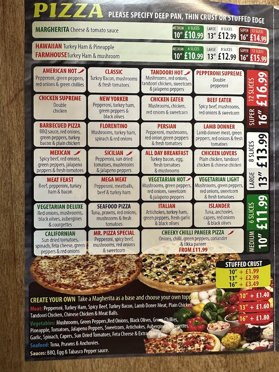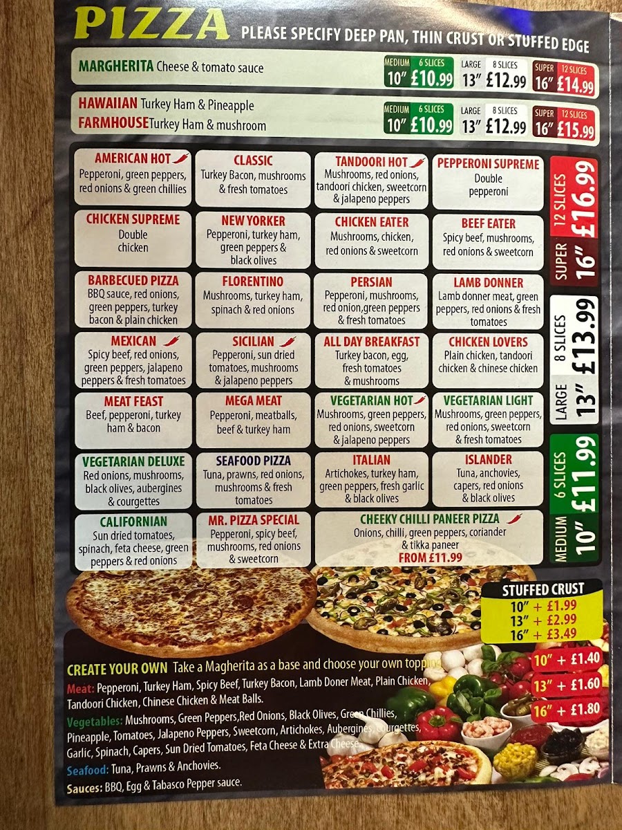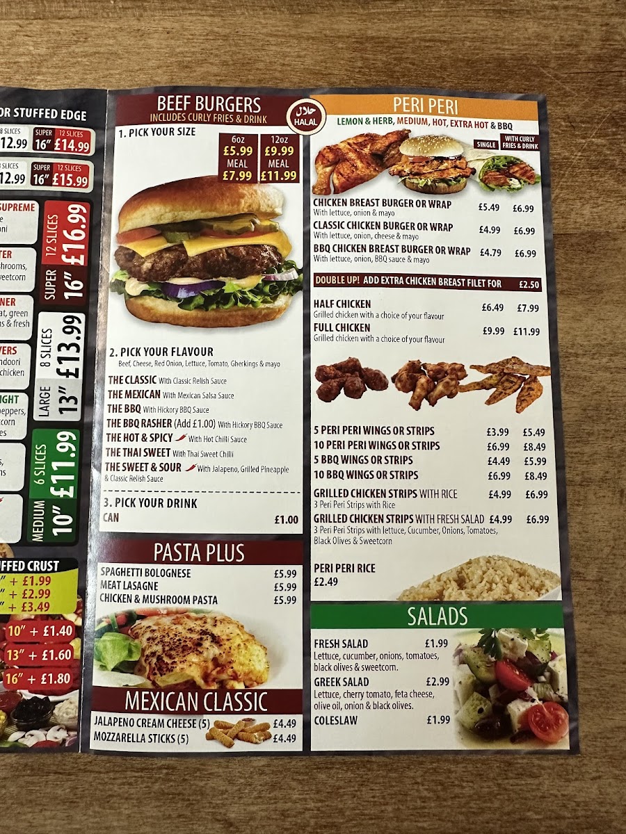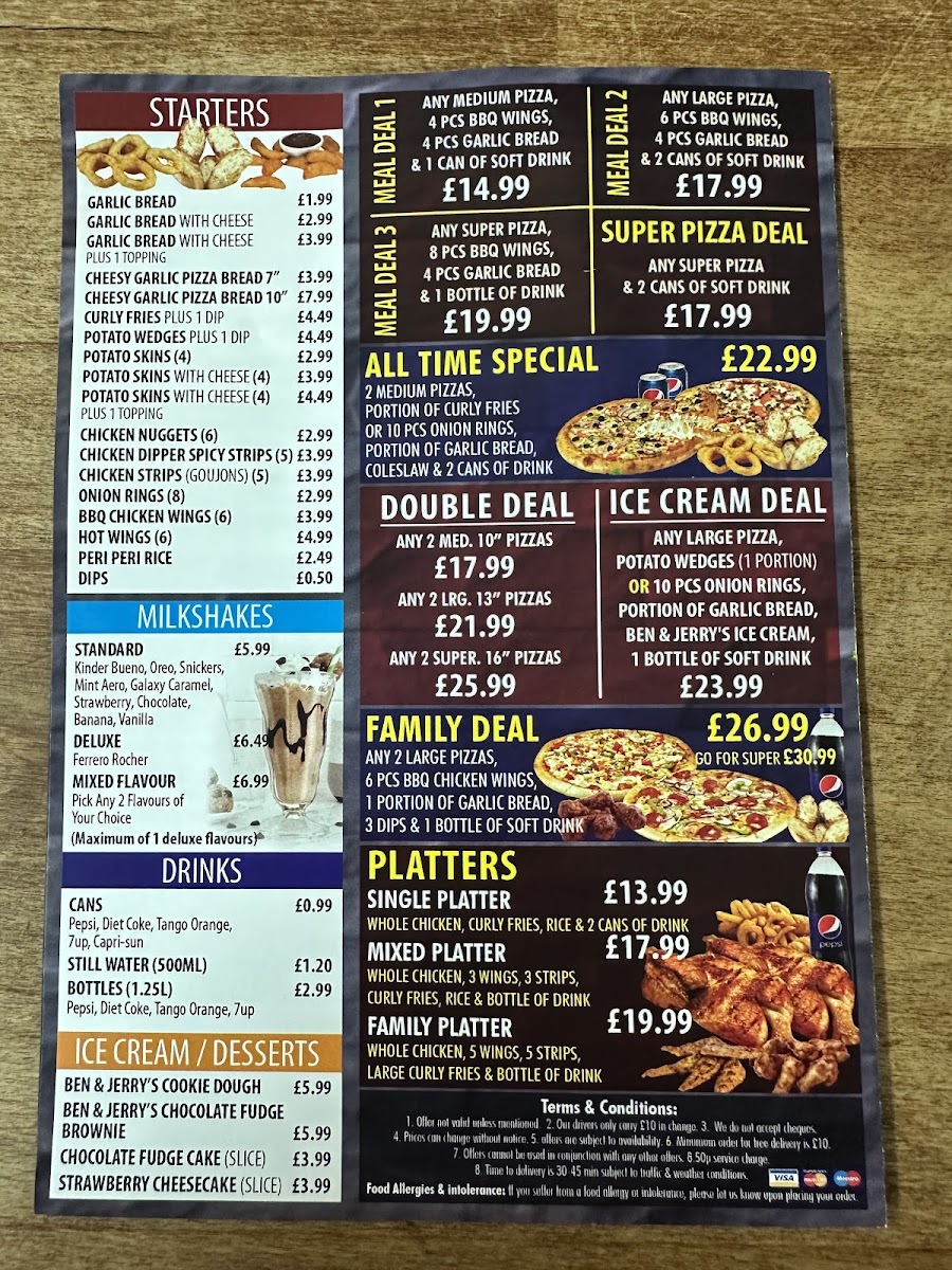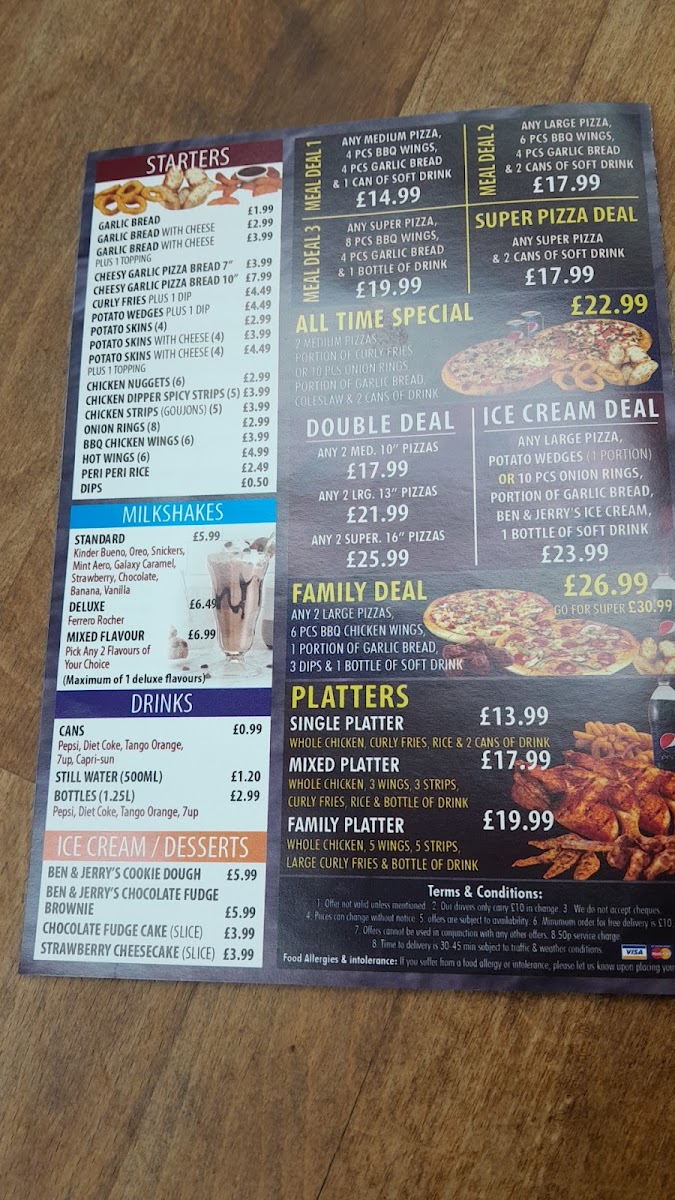 From a reviewer’s perspective, the menu at Mr Pizza & Burgers offers a broad and satisfying selection that caters to a variety of cravings, from classic pizzas like the 10" Margherita Pizza, 13" Margherita Pizza, 16" Margherita Pizza, and 10" Hawaiian Pizza to great-value combo options such as the Double Deal, Ice Cream Deal, Family Deal 1, and Family Deal 2. Starters like Garlic Bread, Garlic Bread With Cheese, Garlic Bread With Cheese Plus 1 Topping, Cheesy Garlic Pizza Bread 7", and Cheesy Garlic Pizza Bread 10" make excellent sides, while burger lovers can enjoy hearty choices including the 6oz The Classic Burger, 12oz The Classic Burger, 6oz The Classic Burger Meal, 12oz The Classic Burger Meal, and 6oz The Mexican Burger. The menu also stands out for its variety beyond pizza and burgers, with platters such as the Single Platter, Mixed Platter, and Family Platter, plus Peri Peri options like Chicken Breast, Classic Chicken, BBQ Chicken Breast, Half Chicken, and Half Chicken With Curley Fries And Drink. There are also tasty sides like 5pcs Jalapeno Cream Cheese and 5pcs Mozzarella Sticks, comforting pasta dishes such as Spaghetti Bolognese, Meat Lasagne, and Chicken & Mushroom Pasta, and lighter choices like Fresh Salad and Greek Salad. To finish, desserts and drinks including Ben & Jerry's Chocolate Fudge Brownie Ice Cream Tub 465ml, Ben & Jerry's Cookie Dough Ice Cream Tub 465ml, Chocolate Fudge Cake, Strawberry Cheesecake, Standard Milkshake, Deluxe Ferrero Rocher Milkshake, Mixed Flavour, Tango Orange, Diet Coke Can, 7up Can, Pepsi Bottle, and Diet Coke Bottle round out a menu that feels extensive, affordable, and well-suited for both quick meals and family sharing.